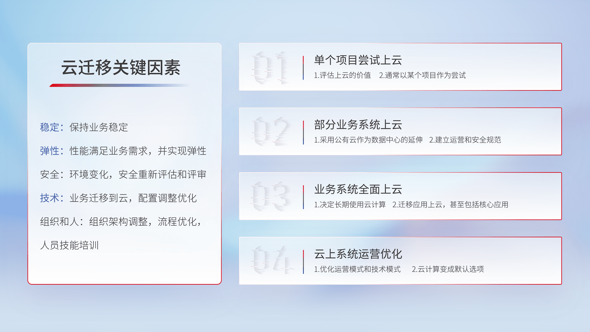 结合实际业务,,,,从规划设计、、云平台选型、、云原生改造、、数据迁移、、集成交付,,迁移全过程为客户识别最佳上云路径,,,做好风险识别管理,,,设计网络架构、、、身份权限、、、安全审计合规、、、操作审计、、日志审计、、监控告警策略、、、多站点容灾设计等,,对云上基础设施进行整体规划,,,,提升IT治理水平,,,,以满足弹性、、、、高可用、、、、高性能的需求。。